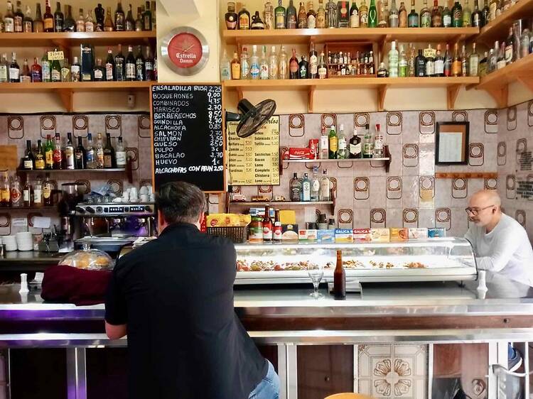Es exactamente esto: una bodega abierta a finales de los años 60 que ha permanecido impermeable a las modas, al turismo y a las gildas a 5 euros. Un lugar delicioso, conservado por su dueño como un facsímil, con botas de vino a granel, tragaperras y precios de antes de los JJOO. ¡Cervezas a poco más de 1 euro! ¡Ensaladilla rusa buenísima a 3!