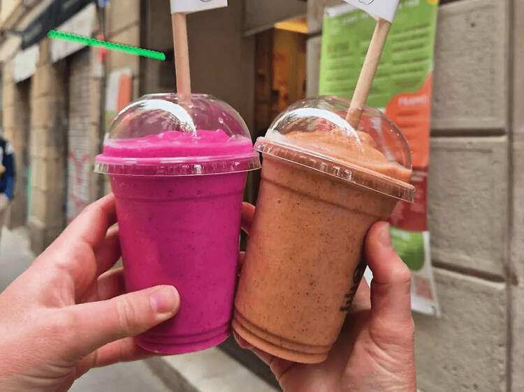 Froots & Roots son los reyes del zumo prensado en frío en el Raval. Su sistema exprime frutas y verduras a menos de 80 rpm, mucho más lento que los exprimidores convencionales, para que cada zumo conserve vitaminas, enzimas, sabor, color y todas sus propiedades naturales. Nada de azúcares añadidos, colorantes ni aromas artificiales: solo fruta y verdura fresca.