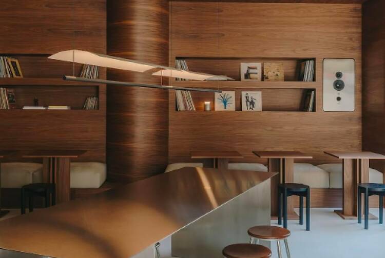 La música, sin embargo, no es la única protagonista del local: el interiorismo del espacio acompaña el sonido de los vinilos. El reconocido arquitecto Isern Serra ha liderado el proyecto y ha reinterpretado con una visión mediterránea los locales de jazz kissa japoneses con materiales y mobiliario pensados para lograr una acústica excelente.