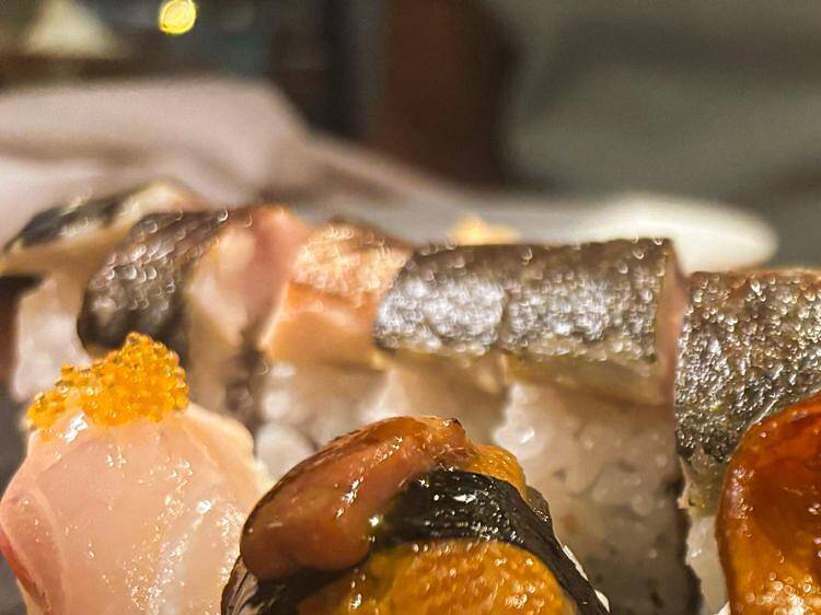 El festival de nigiris llegó con una tanda de cinco piezas de sushi excelentes, dos por cabeza, encabezadas por un nigiri de anguila suavizada con un trozo de foie de Vilobí d’Onyar flameado, que aportaba una textura melosa, pero donde dominaba el dulzor de la anguila: para quien escribe, el rey de los nigiris cuando está bien hecho.