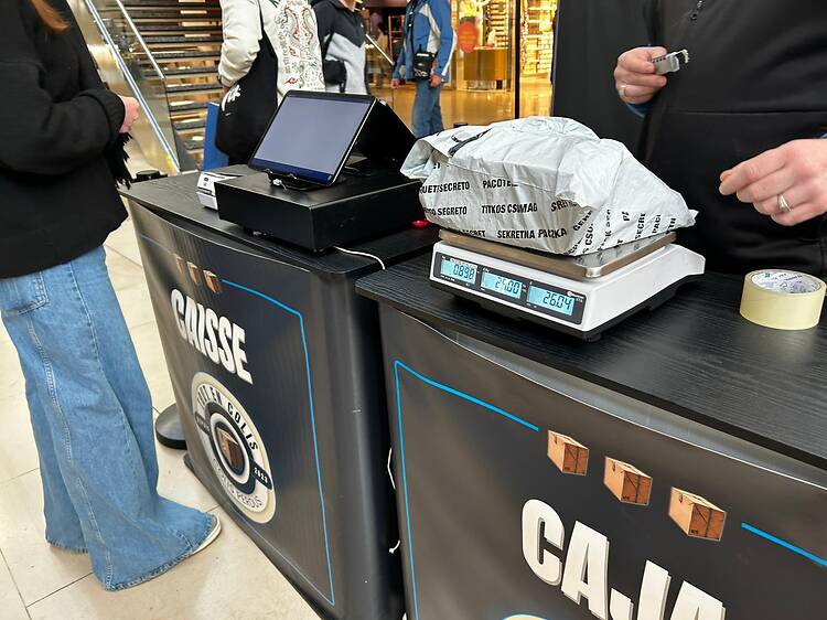 En la parada se pueden encontrar paquetes de peso y tamaños diferentes, y no se puede saber qué hay dentro de cada uno porque todavía llevan el plástico del envío, así que la compra es totalmente sorpresa. El precio de cada paquete es de 2 euros por cada 100 gramos, así que el coste depende del volumen, no del objeto que hay dentro. Nunca se sabe: quizás te gastas 15 euros y acabas con un objeto que cuesta 80, o al revés.