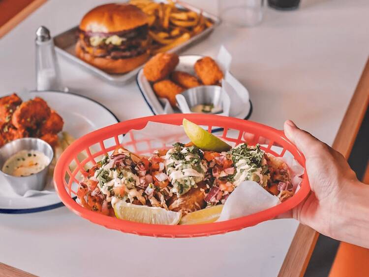 En este local se ofrece comida todo el día; desayunos, almuerzos y cenas; pancakes dulces y salados, hamburguesas, chilaquiles, burritos y huevos. Su especialidad es el pollo frito, presente en platos como el Fried Chicken Benny y los Chicken and Waffles. También hay opciones vegetarianas como tostadas de boniato y kale, tortillas de espinacas o hamburguesas de elote, y para los golosos, tartas irresistibles. La carta de bebidas incluye café con refill de especialidad (¡aprovechad!), zumos naturales, vinos y cócteles. Con el encanto clásico de un diner americano.