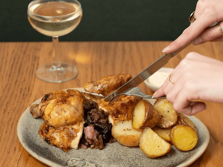 Rooster & Bubbles es la actualización de las clásicas pollerías-restaurante. Por 13,50 euros, medio pollo a l’ast criado en suelo y con alimentación natural llega a la mesa con patatas asadas y alioli. Una delicia humilde de esas que devoras hasta el cartílago (sí, incluso la pechuga sabe a gloria). Y no todo es pollo: también hay espalda de cerdo (14 euros) y pierna de cordero (16,50 euros), ambos a l'ast, con la misma guarnición.