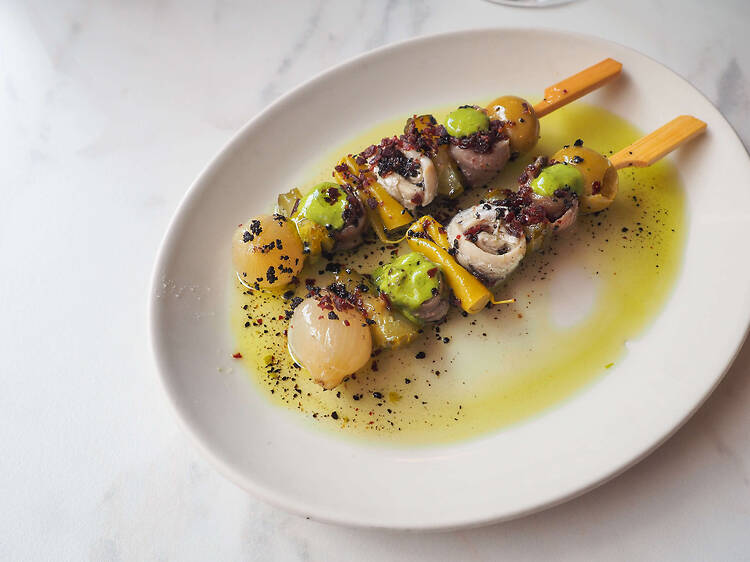 La buena mano de este talentoso chef no se encoge cuando la cosa va de freír al más puro estilo andaluz. De nuevo nos topamos con una tortillita de camarón –fina, crujiente y nada grasosa– y un cazón en adobo –jugoso a la par que sabroso– que ya quisieran firmar muchas tabernas supuestamente andaluzas de la ciudad. El festival continúa con una sardina ahumada que acompañan de salmorejo y que es un auténtico vicio. No hay aristas, todo está equilibrado, por eso el cuerpo nos pide más. Es entonces cuando llegan las ya famosas navajas, que su equipo –cuenta con cocineros curtidos en Bistronómika, Saddle, Quinqué o El Señor Martín– no se limita a sacar de la lata para colocarlas en un plato. Antes de eso, sofríen unos ajos en su propio aceite y luego lo montan con un poco de vinagre para echárselo por encima a los bivalvos. De nuevo te va a tocar pedir más pan.