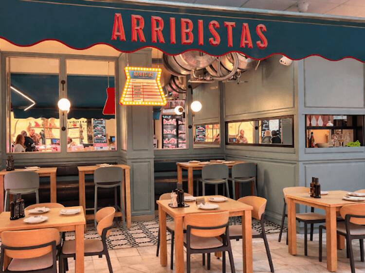 Este es el pilar central de Arribistas que abre por ahora únicamente para el servicio de mediodía de lunes a viernes, cuando todo alrededor está a punto de bajar la persiana para volver a levantarla unas horas después. Una comida sin el bullicio habitual de clientes y carretillas que van a vienen. Para el plato principal no hay duda pero la propuesta se completa y se estira con otros puestos que también gestionan ellos. Aquí tenéis los quesos de Bon Fromage, los embutidos de Amor de Bellota o las especialidades de The Cachopu Factory. El plan puede empezar con una alcachofa braseada con velo de panceta ibérica, unas croquetas de jamón o una ensaladilla de gambas al ajillo o escoger, si vas con hambre, alguno de los platos tradicionales de cuchara que hacen y cambian a diario para acabar compartiendo una chuleta sea de raza gallega, simmental o frisona.