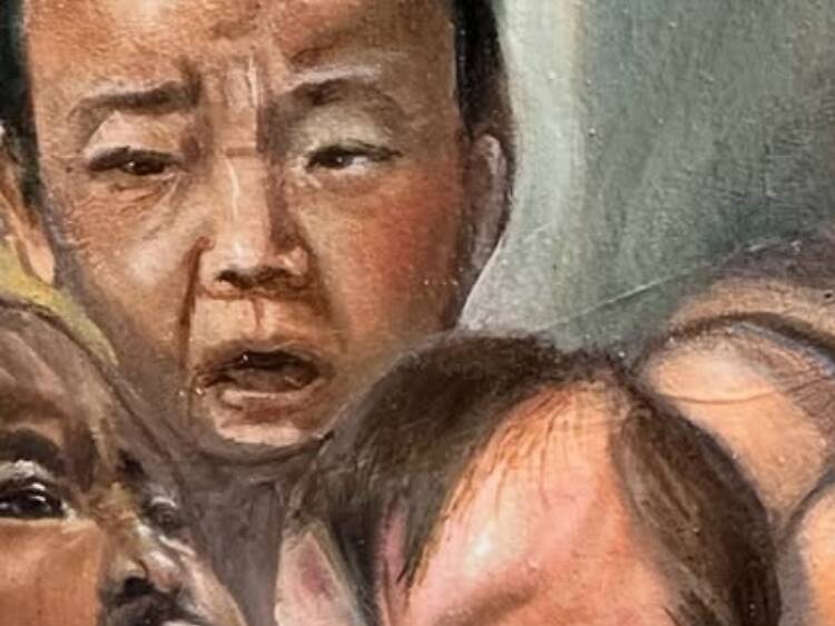 Un arma que se representa en Death of Eros, pieza central de la muestra en la que se pueden ver a más de 25 figuras políticas de los últimos siglos, como Martin Luther King, la Reina Isabel II, el Papa Francisco, Stalin, Putin o Adolf Hitler. En el óleo, de más de 3 m de largo, las personalidades se representan como querubines llorando sobre un turbulento cielo.