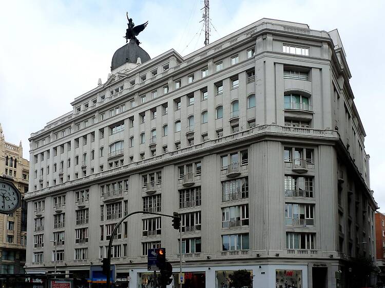 Ya en la Gran Vía, el mapa recoge tres paradas. En el número 32, los Almacenes Madrid-París, primeros grandes almacenes de la ciudad, inaugurados en 1924, y únicamente estuvieron abiertos durante una década. Bajando la calle, en el número 7, estuvo EISA, segunda casa de alta costura del modisto Cristóbal Balenciaga en España. En Gran Vía, 8, tuvo su espacio la marca española de lujo más reconocida actualmente en el mundo: Loewe.