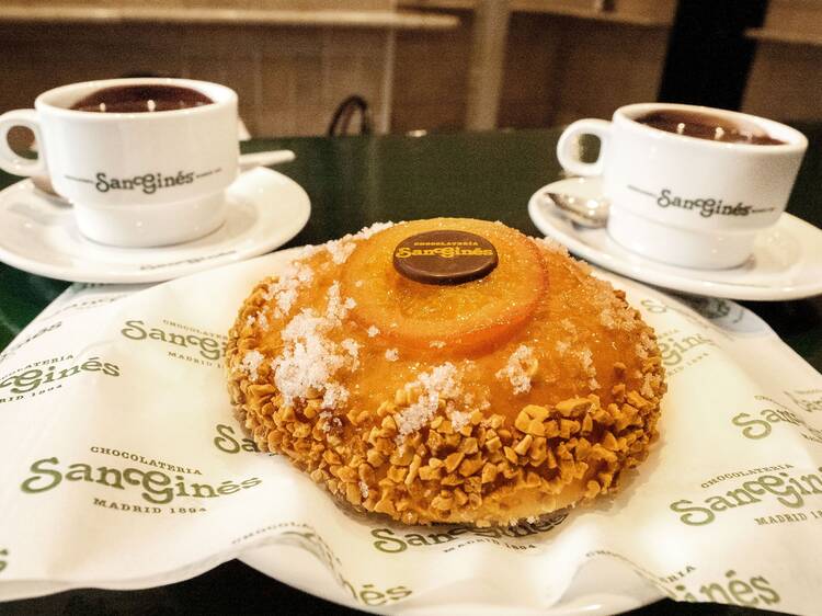 Esta dulce propuesta fusiona la textura esponjosa y el aroma del roscón artesanal con la cremosidad y el sabor inconfundible del chocolate más emblemático de Madrid, ofreciendo una experiencia dulce totalmente nueva que celebra lo mejor de ambas tradiciones. Elaborados con masa madre e ingredientes de gran calidad, estos pequeños bocados destacan por su masa de brioche tierna y aromática, enriquecida con agua de azahar, miel y aceite de oliva, y coronados con un baño de mermelada de naranja, almendras y naranja natural confitada.