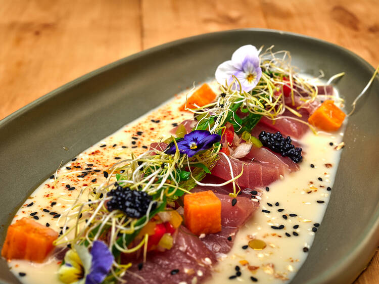 Con un enfoque artístico y técnico, en la carta podéis encontrar creativas propuestas como yuquitas fritas, tequeños, patacones, papas rellenas, tamal sanpedrano, chupe de langostinos, una variedad de ceviches y tiraditos, ají de gallina, pato gaucho, arroz chaufa o pescado a lo macho, entre muchos otros. Y, por supuesto, tampoco falta el pisco sour.