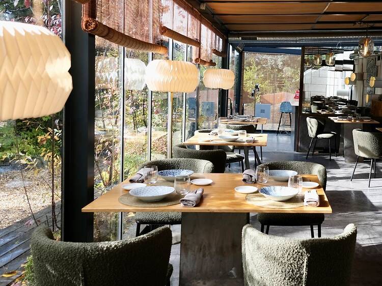 Sí, se ha traído sus famosos torreznos pero también podéis empezar el paseo con una butifarra de corvina acevichada, una trucha ahumada en la casa o unas setas o verduras que cambian, aparecen o desaparecen según la temporada. La propuesta trae algunos arroces (desde un meloso a uno al horno con chipirón) y también varios platos de cuchareo a cada cual más apetecible tanto en la presente primavera como cuando se instale el otoño: guiso de morro y pata con garbanzos fritos, judiones con conejo y verdinas con rape... Y todo sucede en una sala inundada de luz, diseño y elegancia, atravesada por las sombras de todos los árboles que rodean la escena. Un nuevo rincón gastronómico que encaja para una cena romántica y para escaparse con un grupo de amigos.