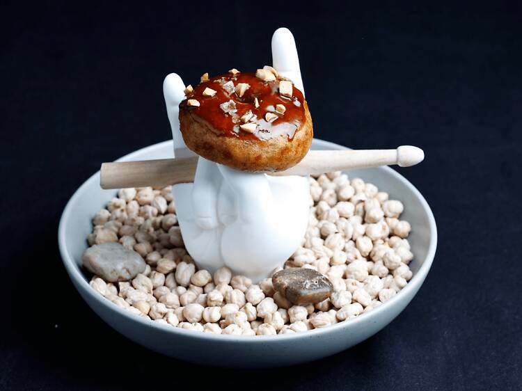 La tapa reinterpreta los callos a la madrileña combinando la intensidad del guiso tradicional con matices dulces, cítricos y tostados. La receta de Carlos parte de un sofrito elaborado con cebolla, zanahoria, ajo y tomate, al que se incorporan garbanzos y callos a la madrileña cocidos con chorizo y morcilla. Esta es la base principal del relleno. Para dar forma al bocado se utiliza una masa tipo buñuelo hecha con harina, miel y huevo, que envuelve el guiso antes de la fritura. El acabado se completa con una salsa elaborada con el jugo del propio guiso, enriquecida con mantequilla y cacao. El conjunto se remata con ralladura de lima y almendras. Gochismo ilustrado. Una creación más "ligera" de lo que parece al conocer su elaboración. Y, por supuesto, tremendamente adictiva. El nuevo "must" de Madrid a la hora del aperitivo.