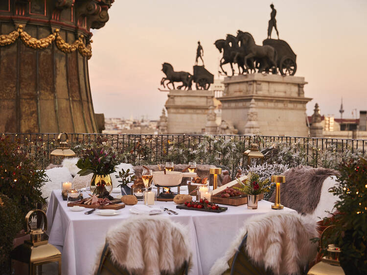 En la séptima planta, Dani Brasserie, la firma de alta cocina de Dani García, propone una Navidad más cosmopolita, con vistas espectaculares desde su Winter Terrace, un rincón après-ski urbano con fondue al champagne, ostras y copas de Ruinart. El restaurante celebra Nochevieja con un menú de alta costura gastronómica que incluye caviar Oscietra, wagyu A5 de Kagoshima y tiramisú de trufa negra. Además, la azotea de Four Seasons Hotel Madrid acoge el brunch de Año Nuevo y el brunch de Reyes, ambos con estaciones de mariscos, carnes y panadería artesanal, showcooking y la visita especial de Papá Noel y los Reyes Magos para los más pequeños.