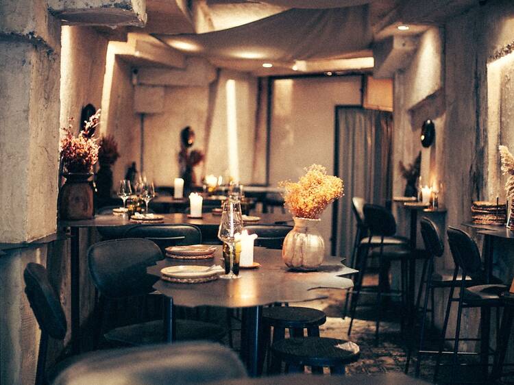 En línea, el interior del restaurante ha sido concebido como un espacio en el que la estética es parte esencial del relato. Por eso, su interiorismo –a cargo del estudio de arquitectura 83 Estudios– evoca una geografía misteriosa, tarea para la cual se juega a combinar formas orgánicas y se emplean materiales nobles, buscando recrear la sensación de adentrarse en una caverna abierta al mar. Las paredes de tonalidades terrosas recuerdan a los acantilados erosionados por el viento y el agua. También hay detalles marítimos, como si el lugar hubiera sido descubierto tras siglos sumergido en el imaginario colectivo y las texturas empleadas son naturales —piedra, lino, madera y cerámica artesanal— creando así un ambiente tranquilo, de serenidad.