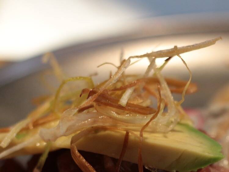 Otra alusión castiza y ganadora es la de sus torreznos Paquita Salas (8 €). Finos, de corteza crujiente, nada grasientos dentro de que Nathalia se pone muy exigente con esto. Con el aguachile de gambas (18 €) ya comienza el viaje más puramente latino, como con el guacamole de la casa (12 €), muy suave, fresco y untuoso. Lleva piña por encima, que aporta punch ácido, y dentro está cocinada con aceite de oliva para dar melosidad al conjunto. Los totopos de maíz son de Las luchas MX, una garantía.