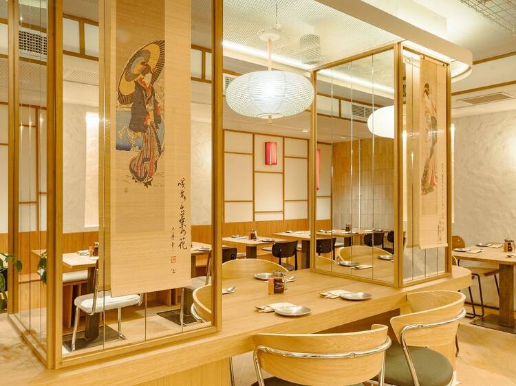 El local, con diseño y estética nipona en versión low cost, cuenta con dos plantas de comedor y una distribución pensada para una rotación alta de mesas, que, aunque admiten grupos grandes, son en su mayoría para dos, tres o cuatro comensales. Servicio sin mantel, con la distancia justa entre comensales, pero atendido por un equipo que trabaja de manera eficiente y con esperas muy razonables entre un pase y el siguiente.