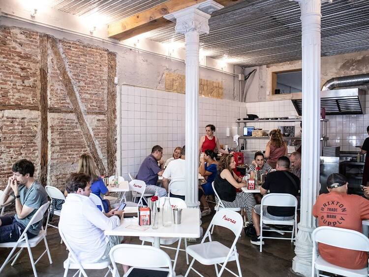 El número de taquerías crece y crece en la capital. Sin embargo, el “efecto teletransporte” a las calles del país norteamericano en el que el taco es el rey es pocas veces tan efectivo como en Puerco, cuyo lema reza “Coma feliz, duerma sabroso". Este concepto es resultado emprendimiento de la pareja formada por Andrea y Carlos –ella mexicana y encargada de la sala, él español y a los mandos en la cocina–, cuya máxima es ofrecer tacos en Madrid como si estuvieran servidos en México. Recetas clásicas, tortillas y totopos elaborados en el mismo local, servicio rápido y precios que permiten repetir visita sin tener que romper la hucha.