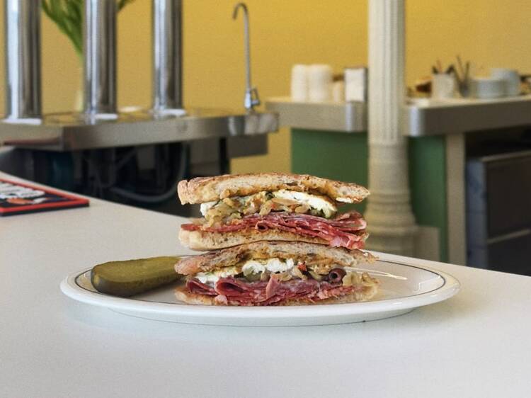 Pero The Diner tiene sus encargos fundamentales. Están los pancakes de Watts, con mantequilla y sirope de arce, o con beicon y huevos. Están los waffles con pollo frito, irresistiblemente excesivos: lo tempurizan al estilo coreano con una mezcla de harina, fécula o maicena, y especias antes de entrar a la freidora para lograr un rebozado muy crocante que con el sirope no se reblandece. Y está el Reuben, otro clásico de Nueva York, sándwich de ternera en salmuera, chucrut, mostaza y queso suizo. También el bocadillo de albóndigas caseras, con carne de ternera y parmesano, pequeñas y muy italoamericanas.